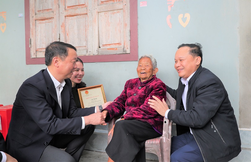 Đồng chí Chủ tịch UBND tỉnh trao quà Tết, chúc thọ cụ Bùi Thị Rớt (SN 1926) ở thôn Tri Lễ, tròn 100 tuổi.