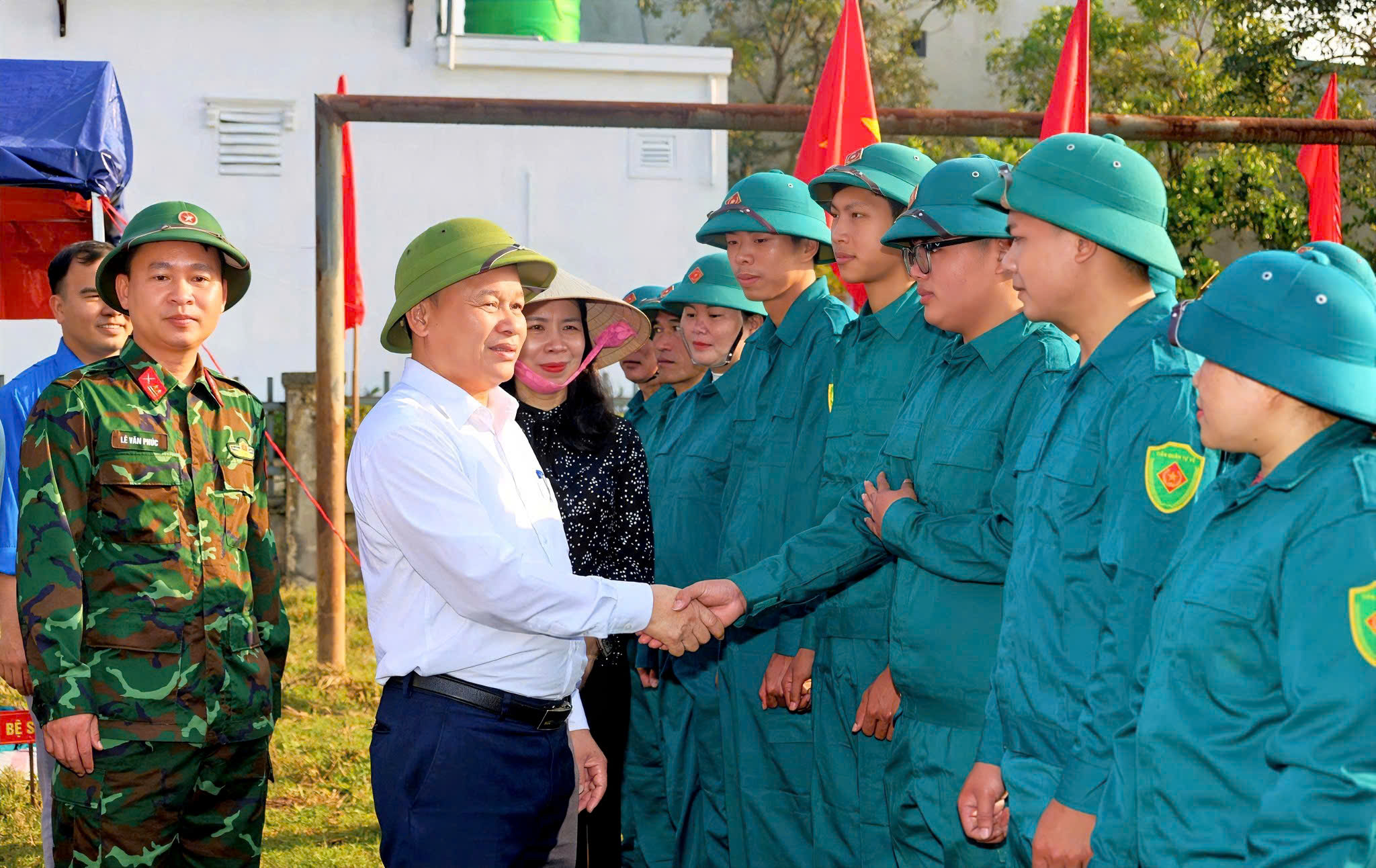 Đảng uỷ, HĐND, UBND, UBMTTQ xã động viên chiến sỹ dân quân huấn luyện tại Sân vận động thôn Phù Ích.