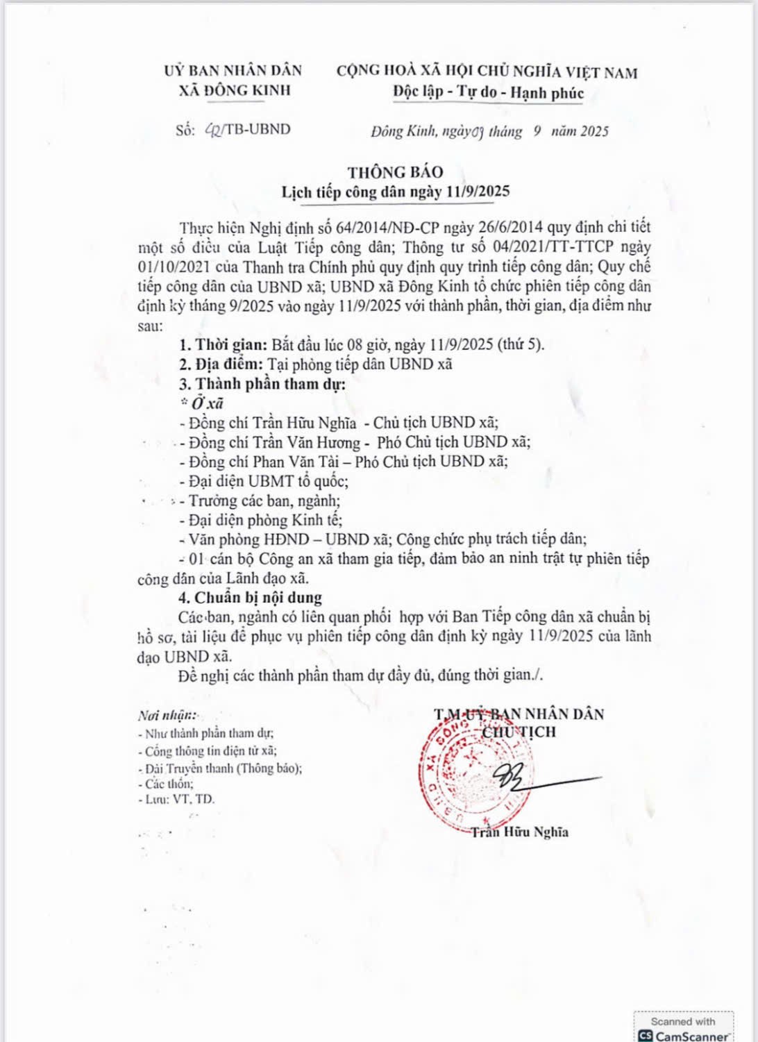 THÔNG BÁO LỊCH TIẾP CÔNG DÂN NGÀY 11/09/2025